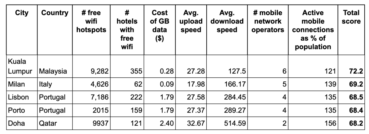 - Portugal is a digital nomad’s preferred location for cheap connectivity. Both Lisbon and Porto cracked the top five, offering excellent Wi-Fi availability and download speeds that average well over 280 Mbps.