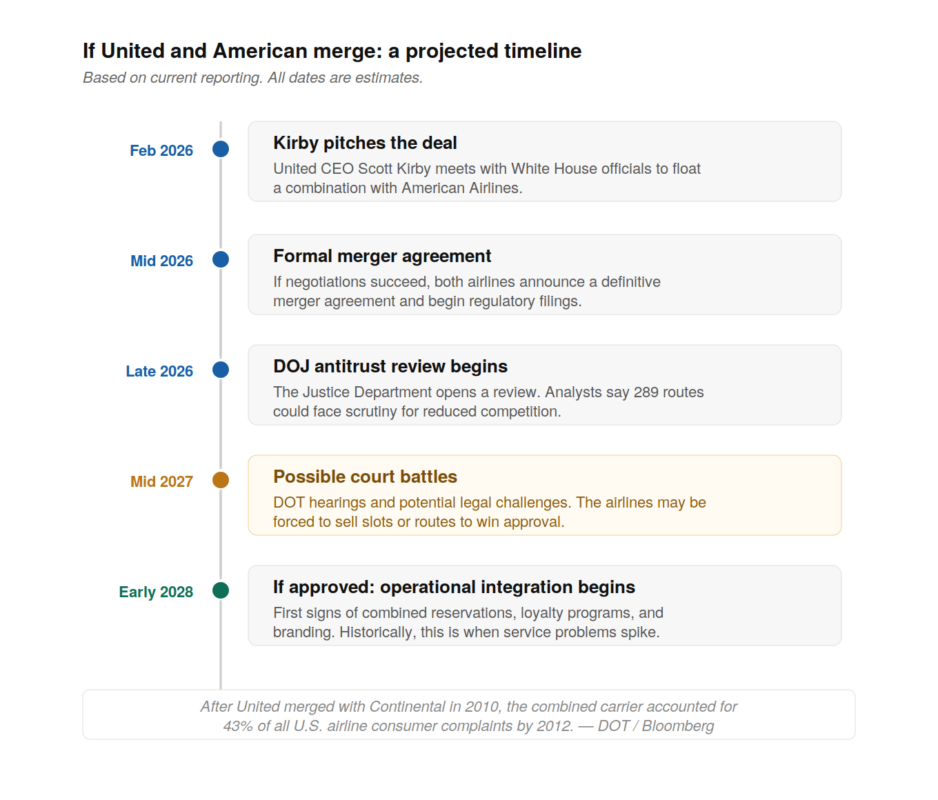 United Airlines CEO Scott Kirby reportedly met with administration officials at the White House in February to float an audacious proposal: a combination with American Airlines.